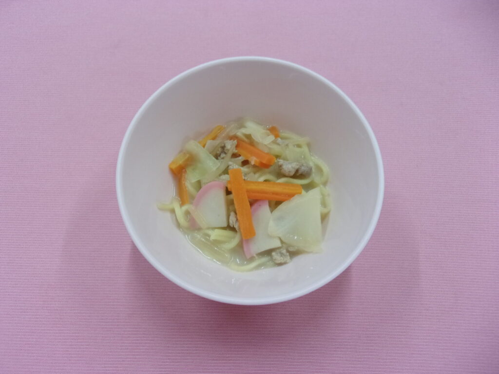 ◆ちゃんぽんラーメン 中華めん、豚肉、かまぼこ、キャベツ、人参、もやし、ごま油、牛乳、がらスープ、しょうゆ