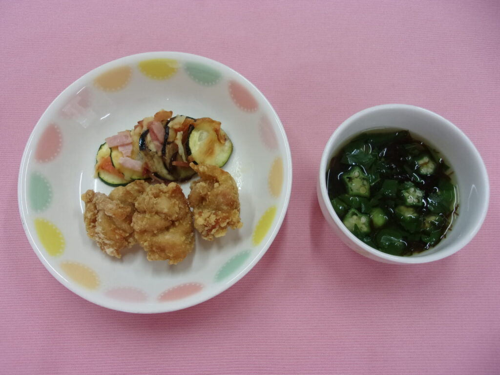 ◆鶏肉のカレー風味揚げ 鶏肉、カレー粉、酒、しょうゆ、塩、片栗粉、油 ◆ズッキーニとトマトのチーズ焼き ベーコン、トマト、ズッキーニ、チーズ ◆ねばねばスープ オクラ、モロヘイヤ、もずく、がらスープ、塩