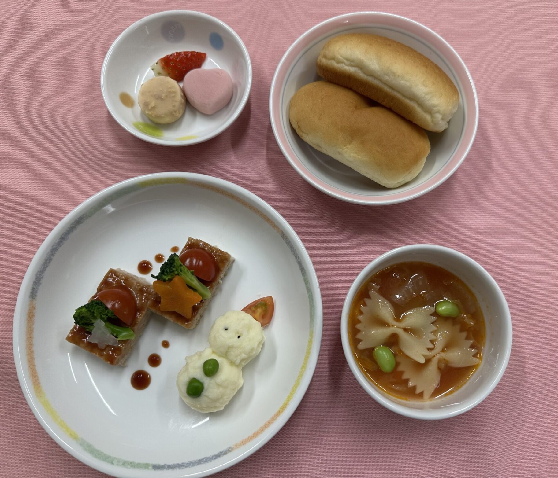 ◆鶏肉のカレー焼き 鶏肉、塩、しょうゆ、砂糖、カレー粉 ◆ごまドレッシングサラダ ツナ、人参、キャベツ、トウミョウ、ごま、マヨネーズ、砂糖、酢、しょうゆ、ごま油 ◆豆乳みそスープ 白菜、大根、人参、ねぎ、豆乳、みそ、がらスープ